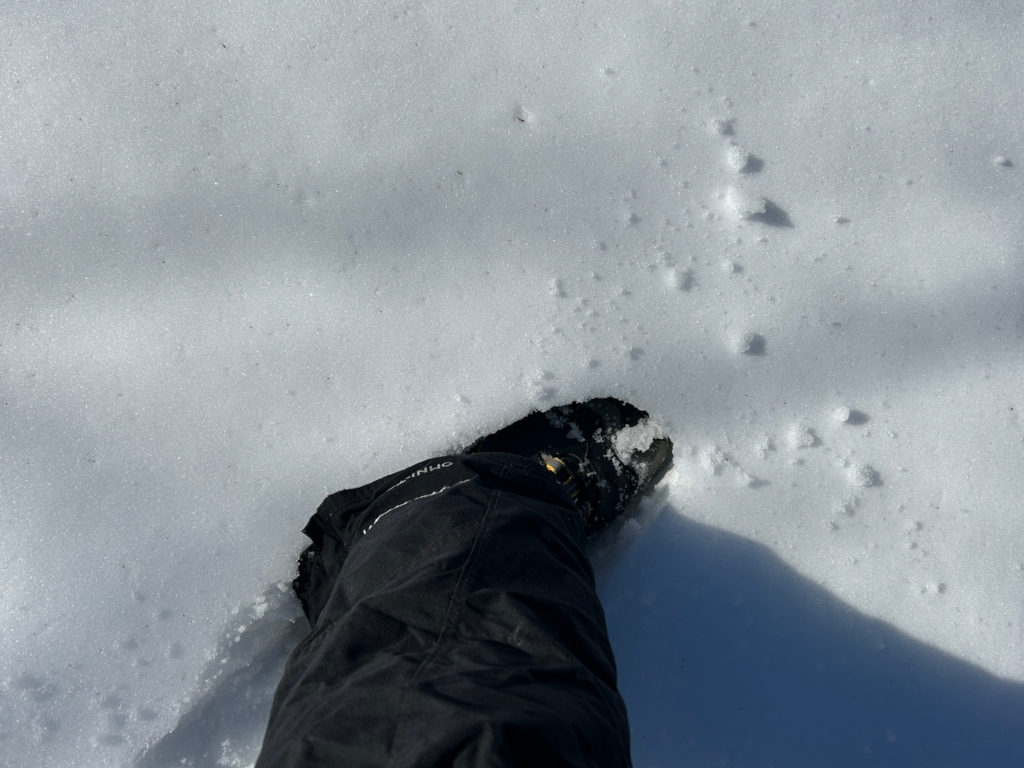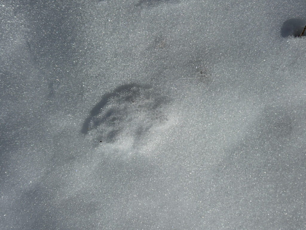 雪が残っているところには、動物たちの足跡も。肉球と指の形が少し残ったキツネの足跡。前脚の痕を後脚で踏むので、綺麗な形の足跡は残りにくいです。
