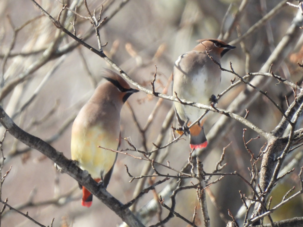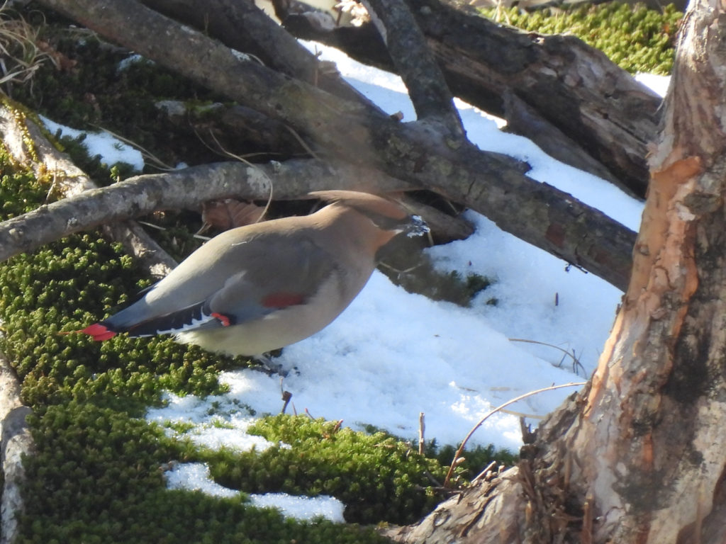 二羽がさかんに地面に降りているので、何をしているかと思ったら、雪を口に含んでいました。水分を摂るためなのか、それとも雪上に落ちている何かをついばんでいたのかは不明。