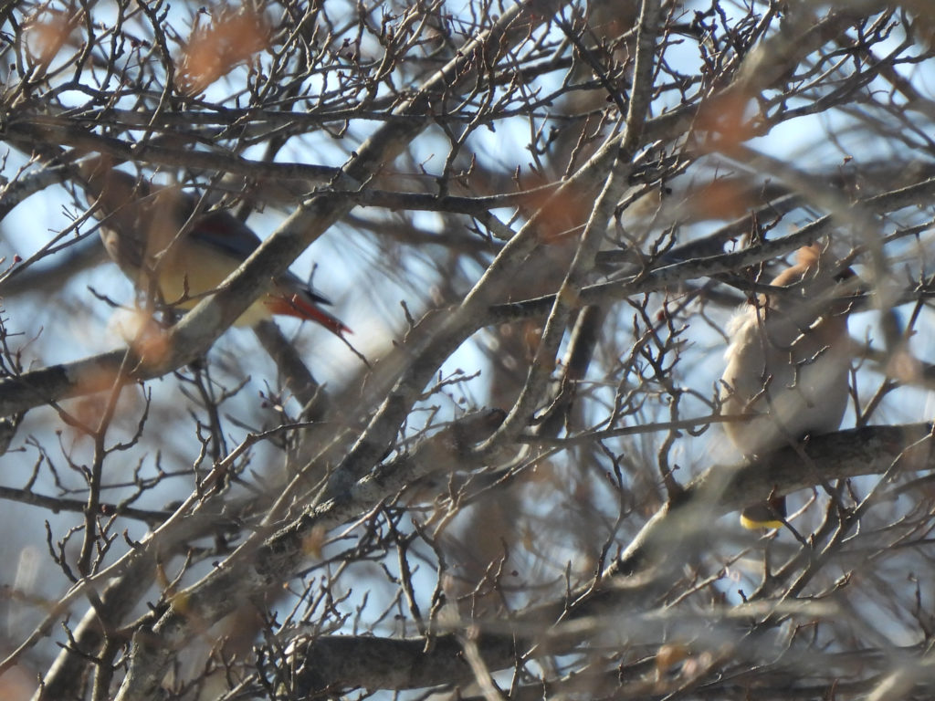 今日は、高い枝にある人気のヤドリギ類の果実と、藪の中のカマツカ果実を、行ったり来たりしながらついばんでいました。