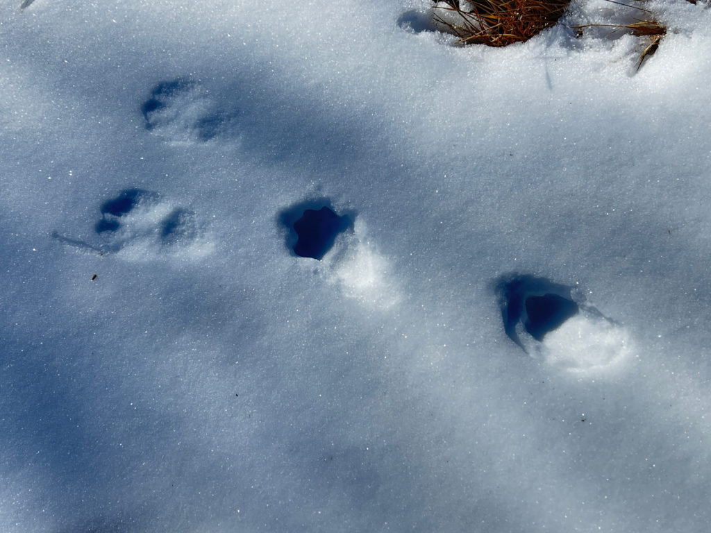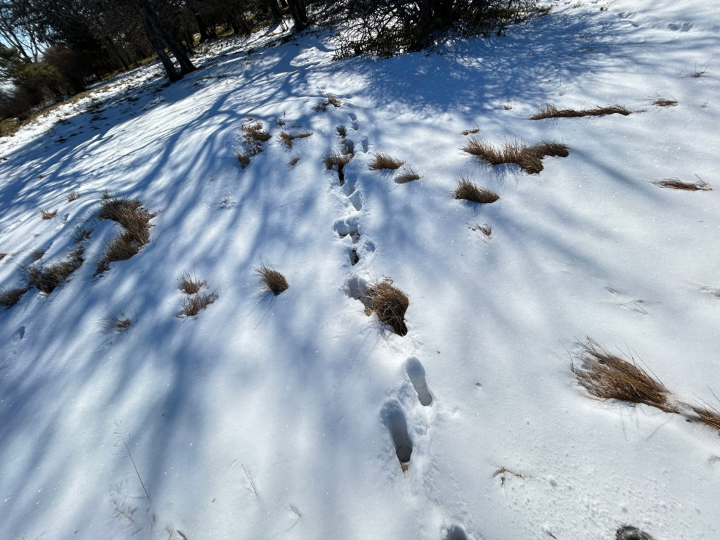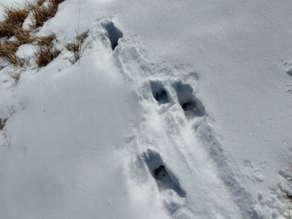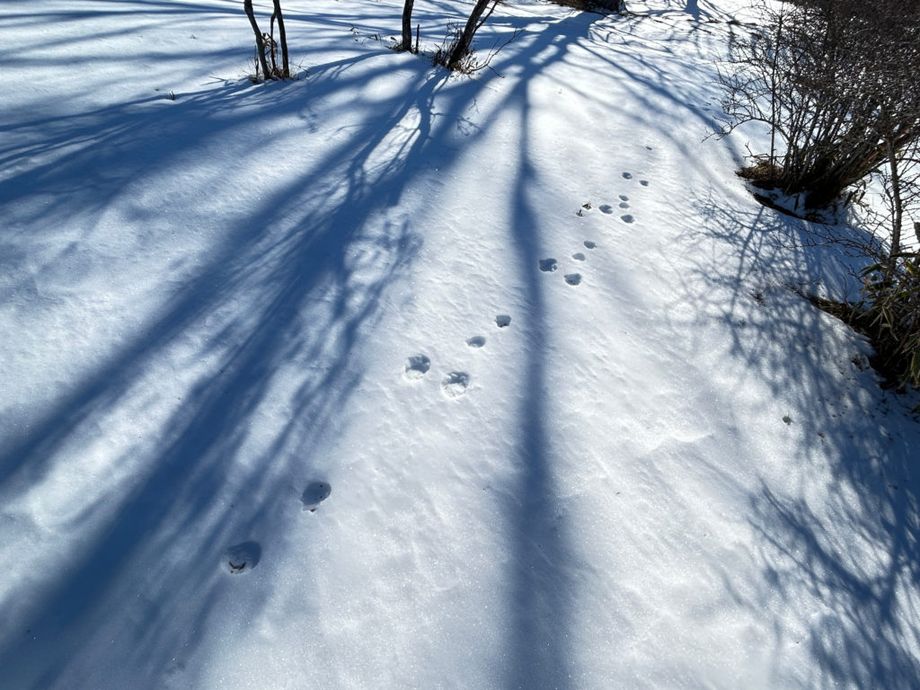 牧場近くは獣の足あとも増えてきます。肉球くっきりのノウサギの足跡。右から左に飛び跳ねていった痕。